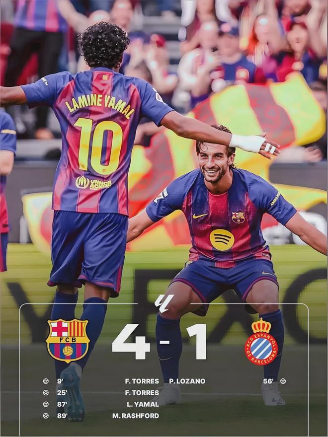 北京时间4月12日凌晨,诺坎普的聚光灯毫无悬念地打在亚马尔身上。面对西班牙人,这位拉玛西亚出品的瑰宝用一记进球、两次助攻,独造三球,将加泰罗尼亚德比变成个人表演的舞台。费兰·托雷斯借势梅开二度终结球荒,巴萨4-1轻取同城死敌,豪取联赛7连胜。