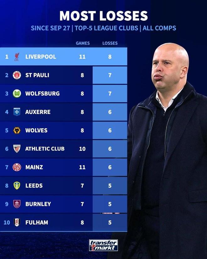 11场输8场,利物浦是自9月底以来五大联赛输球场次最多的队